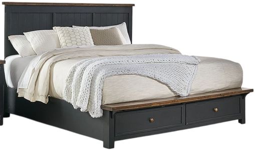Stormy Ridge invites warm hospitality to the bedroom with its practical farmhouse style and generous footboard storage option. Simple elegance is achieved with classic moldings and coordinated wood hardware. Pronounced distressing in the chicory finish mimics the look of time-worn wood that is contrasted by the soft slate black paint.Read More