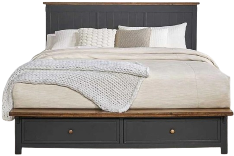 Stormy Ridge invites warm hospitality to the bedroom with its practical farmhouse style and generous footboard storage option. Simple elegance is achieved with classic moldings and coordinated wood hardware. Pronounced distressing in the chicory finish mimics the look of time-worn wood that is contrasted by the soft slate black paint.Read More