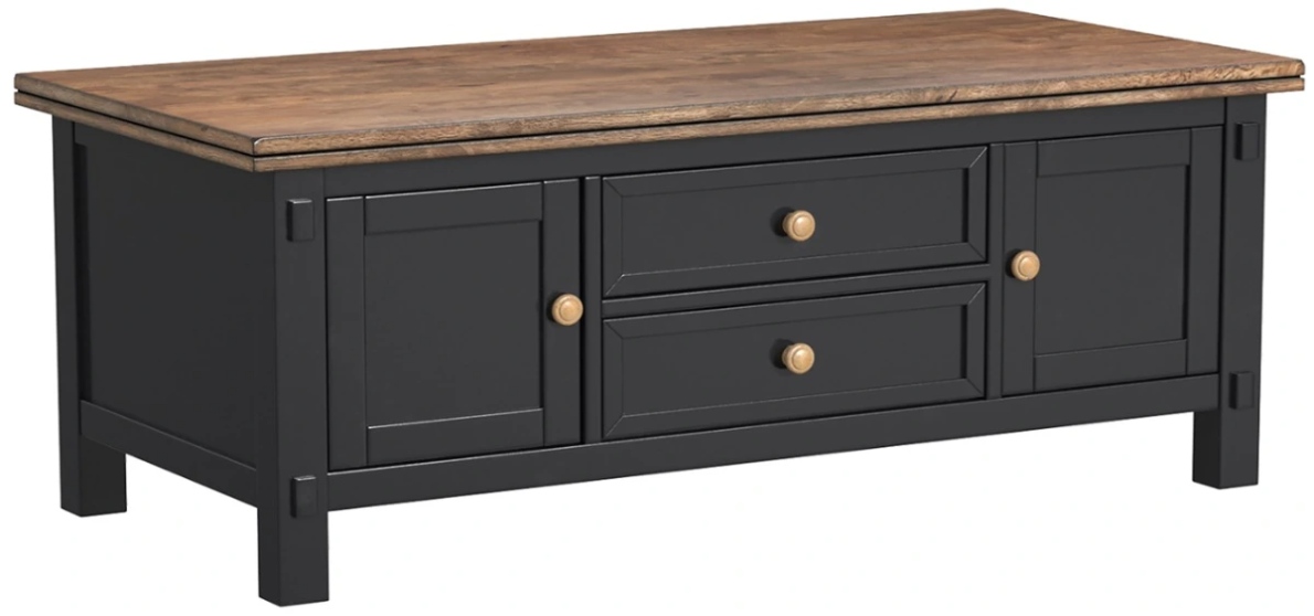 The Stormy Ridge Occasional group makes your family and guests feel right at home with it’s practical farmhouse style. Door fronts feature x-shaped detailing to enhance the hospitable warmth of this collection. Pronounced distressing in the chickory finish of the tops and drawer pulls that is contrasted by the soft, slate black finish.Read More