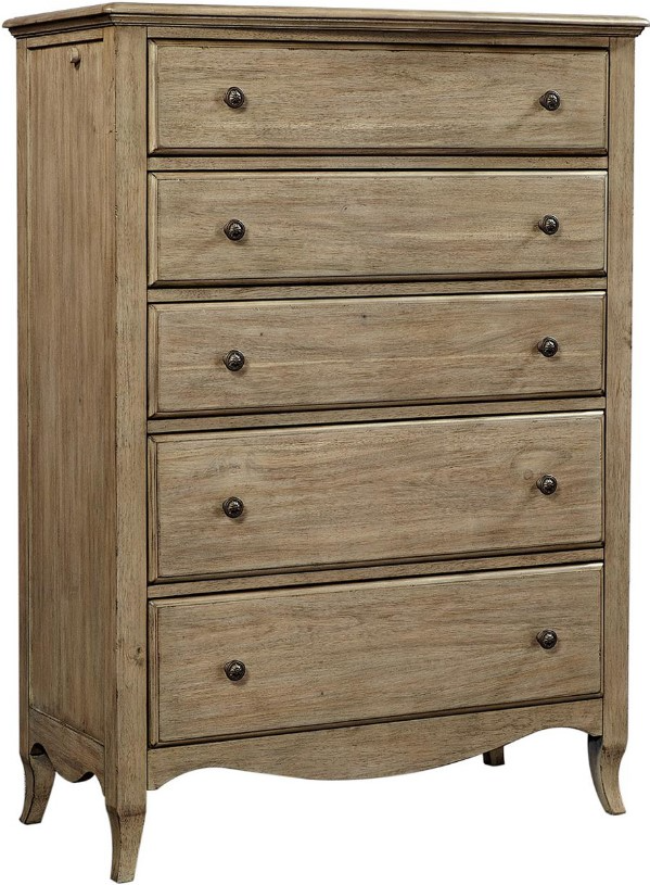 Provence consists of a light, weathered finish on Acacia veneer blending easily with most existing home decor. The gentle curves create a soft, relaxing and livable environment. Custom floral detail knob hardware gives a jolt of excitement turning this classic bedroom into a new classic.Read More