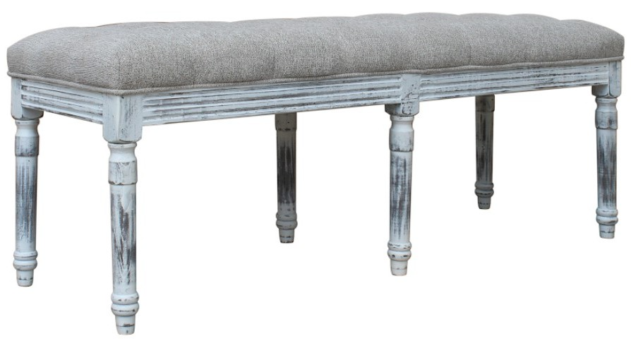The upholstered cushion has deep button-tufting and a welt border that beautifully complements the wood base composed of six turned legs. Versatile, this bench can be used against the wall or at the foot of the bed, or as the perfect accent piece in any room.