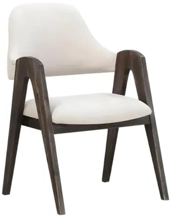 The Aspen Court Dining Chair is built for comfort! A wood frame surrounds two padded cushions, one on the seat and the other on the back rest. An arched back complements the rounded arm rests that flow right into the legs. Cream colored upholstery is a beautiful mix with the dark wood tone.Read More