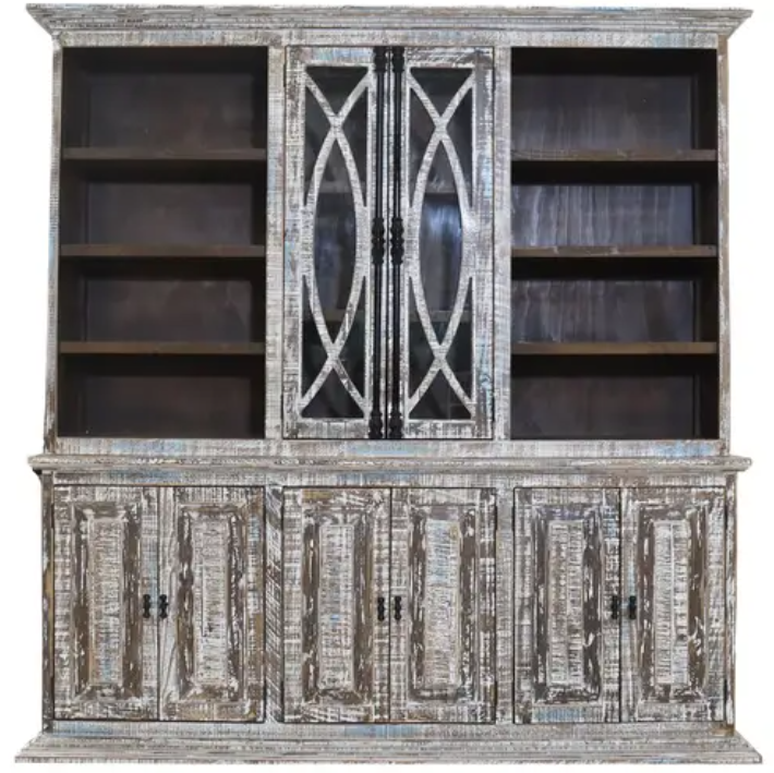 Hand-crafted, the Bahari Hutch & Base Set is composed of two components. On top is a hutch with central glass doors including semi-circular wood trim and decorative metal hardware, and on the bottom is a large console base with four sets of doors and one shelf behind each, for added storage room.Read More