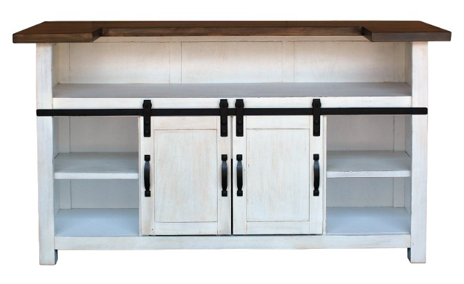 Two sliding cabinet doors, with barn-door style hardware, open to reveal one removable shelf in each cabinet.