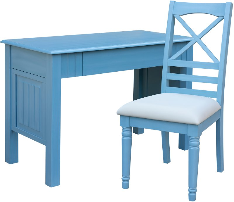 The Beachfront Desk & Chair Set in Ocean Blue is quality-built from solid wood, veneers, and MDF. Perfect for your bedroom or small office, this solid desk has one drawer with a convenient flip-down front with magnetic closure. The drawer is meticulously crafted with dovetail joints and full-extension, metal, ball-bearing drawer glides.Read More