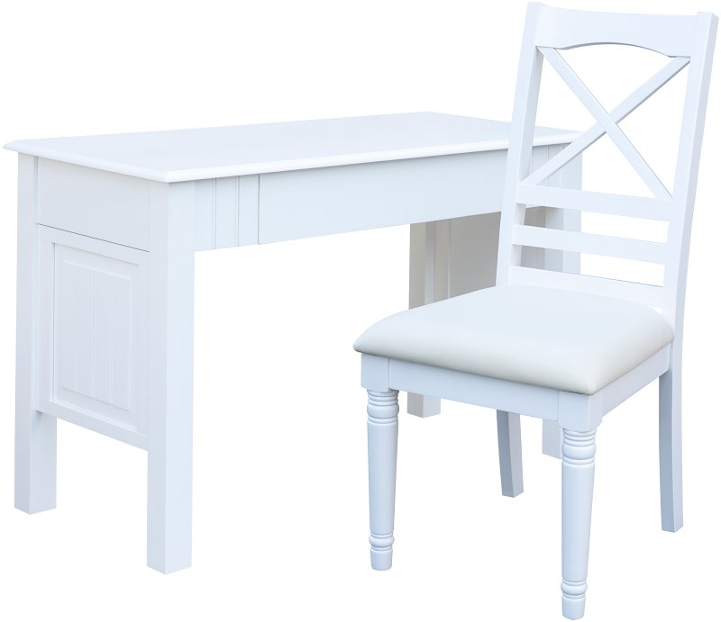 The Beachfront Desk & Chair Set in White is quality-built from solid wood, veneers, and MDF. Perfect for your bedroom or small office, this solid desk has one drawer with a convenient flip-down front with magnetic closure. The drawer is meticulously crafted with dovetail joints and full-extension, metal, ball-bearing drawer glides.Read More