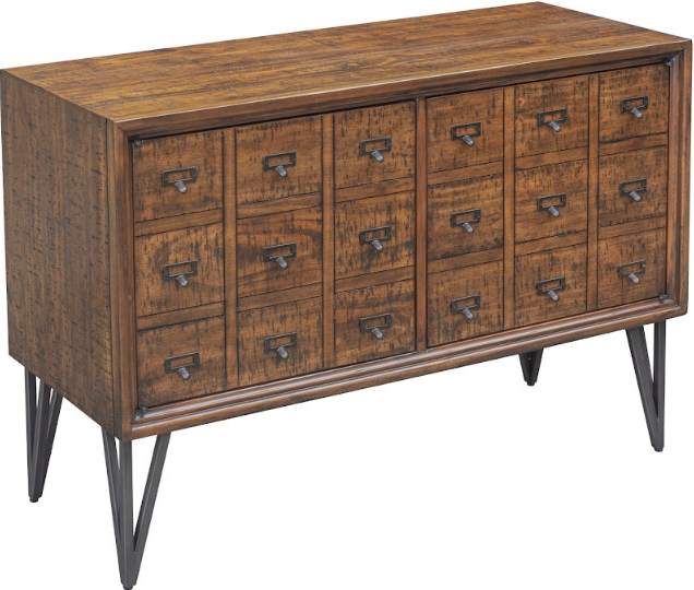 The Boone Two Door Catalog Media Cabinet is designed with a charming vintage look of a card catalog. Updated for functionality in any room, this cabinet has two doors with an interior shelf. Metal drawer pulls and legs complement the distressed wood finish.Read More