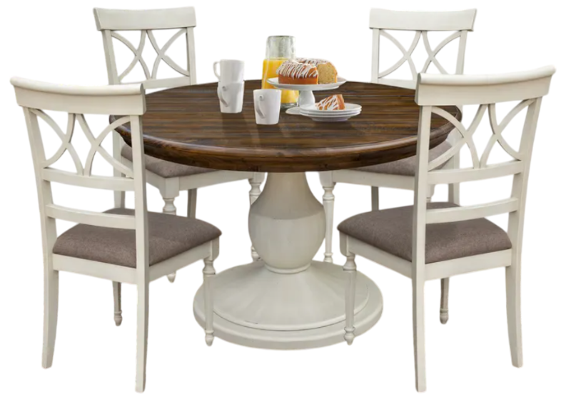 The Cottage Creek furniture 5-piece dining table set offers a warm, inviting look perfect for any dining space. Featuring a rich brown tabletop and crisp white base, it comfortably seats four and brings a charming, cozy feel to family meals or casual gatherings.Read More