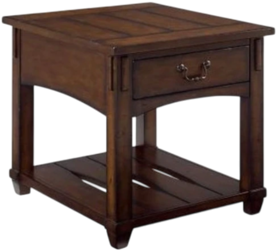 Crafted of Poplar solids and veneers rustic brown finish and burnished edges. Rustic occasional collection with V-grooved planked tops and distressing that give each piece a warm and cozy feeling that is sure to fit in many homes.Read More