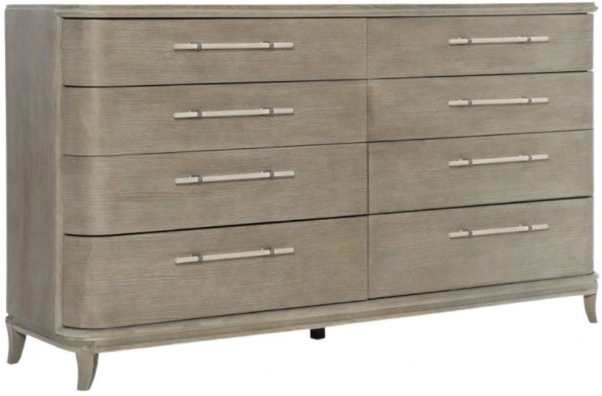 Serene and stylish with simple, clean lines, the Affinity dresser combines a soft rounded silhouette with a wire-brushed greige and antique white finish to create an inviting transitional look. Pewter and antique white bar pulls add intrigue.Read More