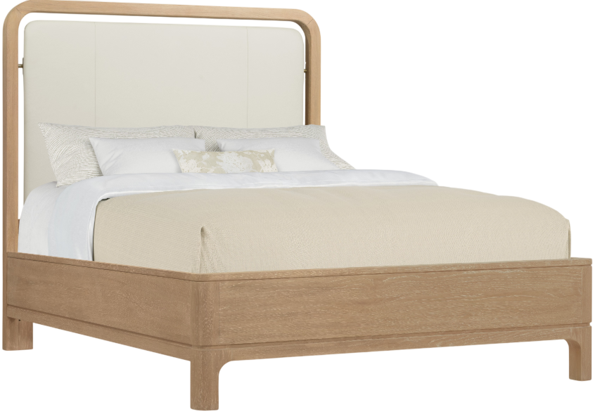 The bed includes a headboard, footboard, and rails, with the leather-upholstered headboard featuring an open frame and metal supports. Its contemporary aesthetic fits perfectly into urban, coastal, or mountain settings, offering a stylish and cozy retreat. Developed with an eclectic mindset, Banyon Bay is youthful and cool, combining precise geometry and gentle contours with natural textures and materials. Delivering smooth contemporary lines, this modern collection is a perfect fit for a casual lifestyle, moving effortlessly between urban, coastal, and mountain settings. Modestly scaled, this collection features white oak veneers and solids in a light Desert Oak finish, accented with an authentic mix of organic materials, creating a cohesive, casual look.