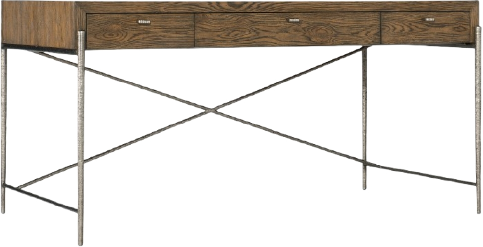 With exquisite scale and craftsmanship, the Chapman Writing Desk is crafted of White Oak Veneers in a warm brown Sorrel finish with thin forged pewter metal legs, an X-stretcher back, and custom hand-hammered metal drawer pulls.Read More