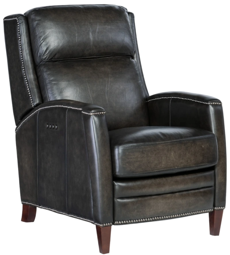 The Declan power recliner with power headrest marries the ultimate in comfort with a stylish, classic silhouette featuring curved arms and antique gold nailhead trim around the arms, base and modified wing back. Covered in the Brindisi Trinita handwiped and finished leather, it features a dark wood finish on the legsRead More
