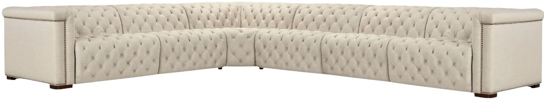 The Savion Deux 6 seat sectional in Aries beach fabric offers three power recliners and seven power headrests, delivering both comfort and durability. Featuring dark wood accents, chesterfield tufting, and copper nail trim, this sectional seamlessly blends traditional elegance with modern functionality.Read More