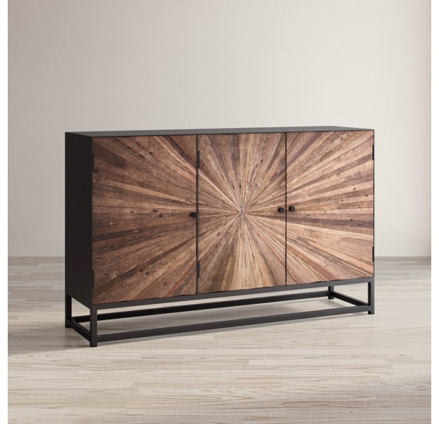 Eye-catching, the dramatic wood starburst pattern on the door fronts are masterfully cut and hand-placed to create an organic and textured look. This piece is balanced out with a grey surround and metal base. Due to the natural variations in the wood grain patterns, each piece is truly unique. Available in two colorways: Natural and Grey Wash.