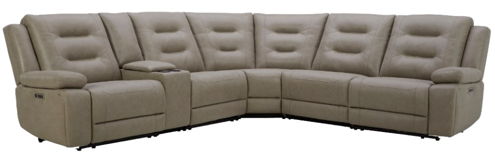 The Caldwell 6-piece modular reclining power sectional in Tahoe Fog is ideal for smaller spaces. Featuring high-performance fabric, padded arms, and USB charging in easy-to-use switches. The center console includes cup holders and storage. Ready for cordless use with a FreeMotion® bracket and battery, allowing flexible placement.Read More