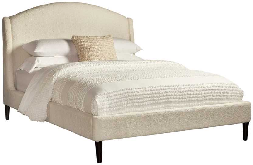 A soft crescent-shaped curve gives this upholstered bed fresh design appeal. Its subtly sloping headboard adds updated character to any bedroom while fully upholstered rails and tapered legs complete the timeless look. Upholstered in a soft, textural bouclé fabric.Read More