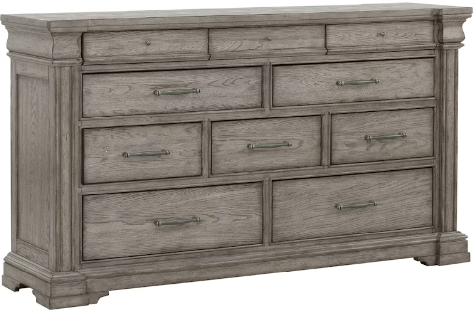 The bracket feet and charming pillar details hint at this 10 drawer dresser's inspiration. A row of slender top drawers glide out to reveal felt bottoms, two slender drawers below, three mid-size drawers, and two large drawers on the bottom. Custom drawer pulls are finished in a charming antique silver.Read More