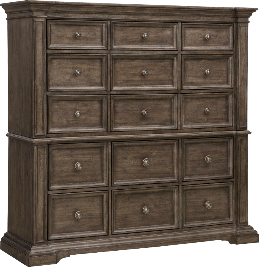 Elevate your bedroom with the Woodbury fifteen drawer master chest. Varying sized drawers cater to your every need, from the smallest trinkets to the most delicate garments. The warm, earthy cowboy boots finish creates a welcoming and cozy atmosphere, while half-cylinder paneling with detailed molding adds character and dimension.Read More