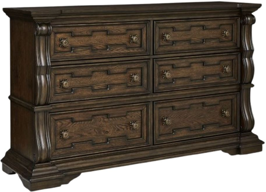 From its ornamental appliques to its large scale, this dresser makes a bold statement. Spacious drawers store your clothes, jewelry and more in stunning style. The look is timeless. The feel? Right at home.Read More