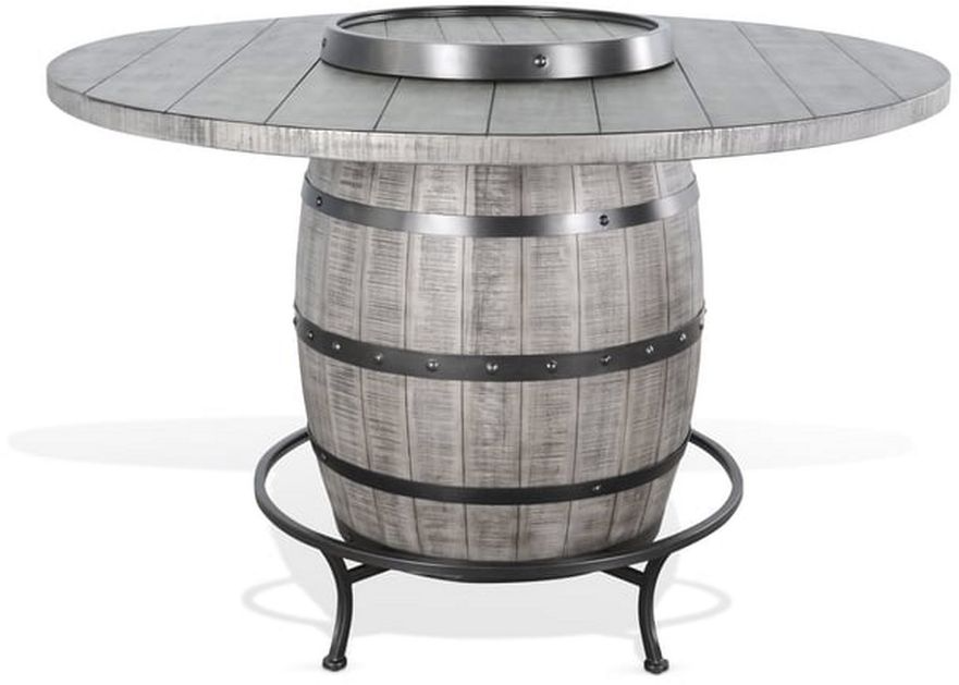 The Alpine Collection is crafted with plantation-grown mahogany. This wine barrel table is designed with a powder-coated metal footrest and rustic accents. Perfect for fun, casual dining.